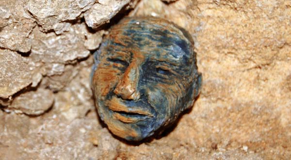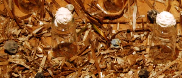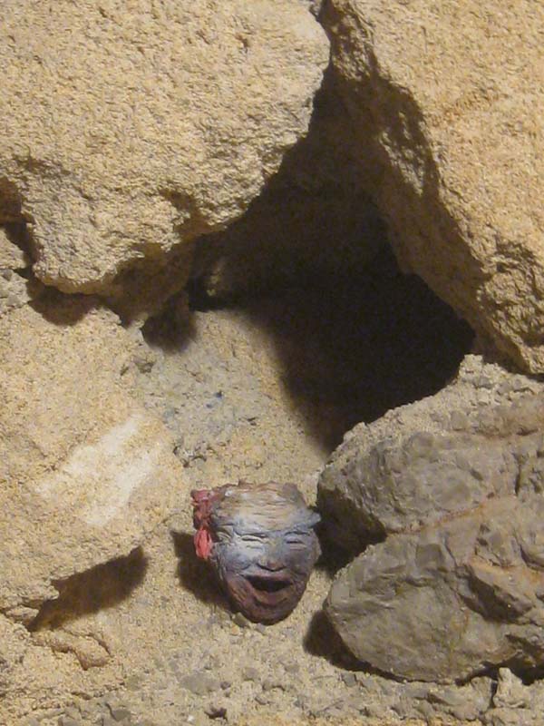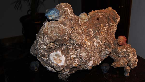 Efectivament, aquesta instal·lació - una mena de diminut foro romà - ens posa fit a fit davant un originalíssim conjunt de testes de petites dimensions, a vegades de manera esparsa, d'altres formant conjunts igualment petits, que aguaiten des de tots els racons de la casa, de les voltes fins al pis de dalt. I generalment ho fan amb un somriure als llavis que ens produeix tot l'efecte que els petits personatges ens contemplen amb un punt de sornegueria, d'amable ironia. I no són 100 sinó 265 els caps que conformen l'exposició.